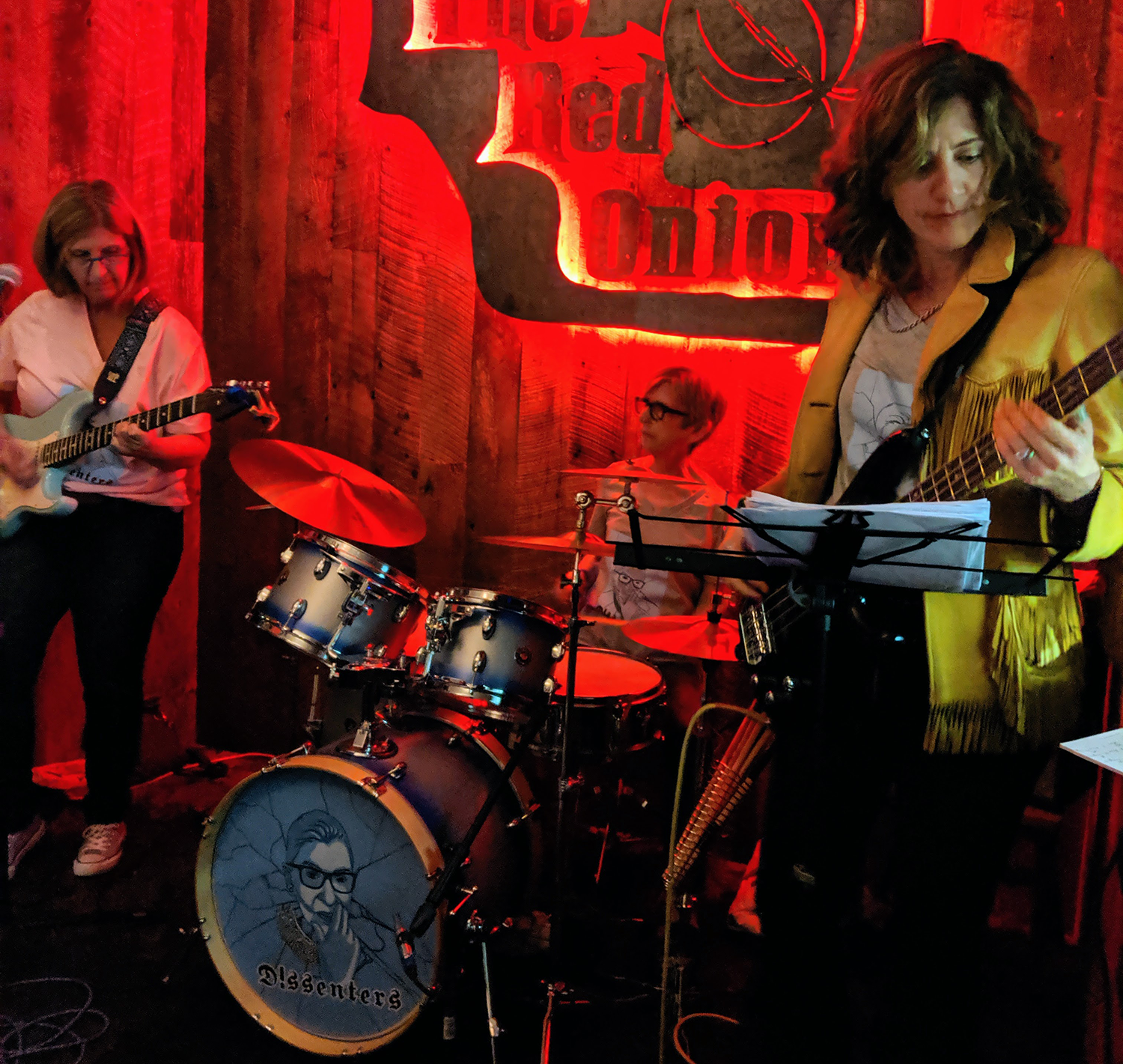 A few years ago, Karen translated her love of listening to punk music to playing punk music—and all sorts of other musical genres. She took up the bass and joined forces with a handful of other female lawyers to form a rock band. A few times a year, they unite at legal conferences and entertain friends and curious onlookers with their favorite cover tunes. The kick drum features the likeness of Ruth Bader Ginsburg. The band is called … The Dissenters.